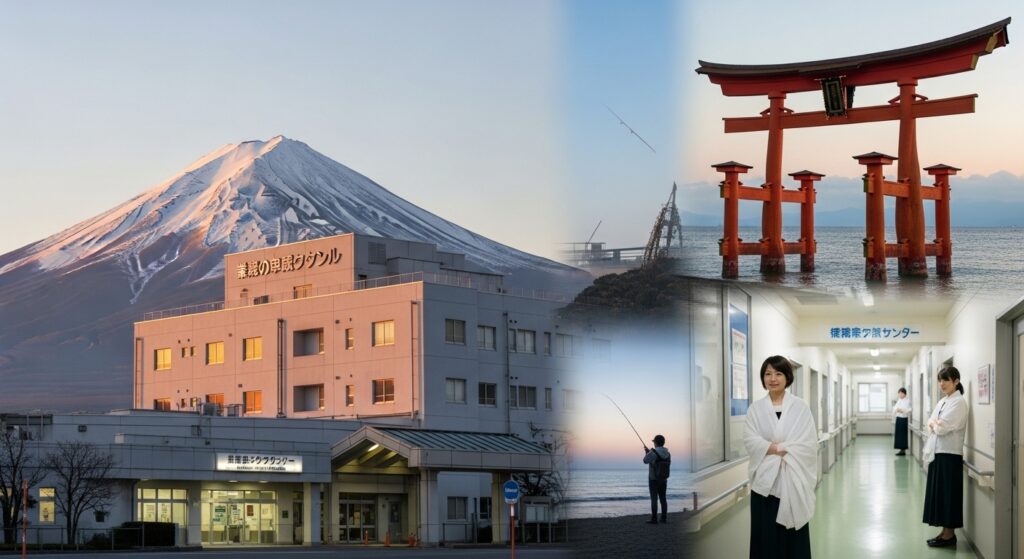 外観には富士山を背にした病院、内部には実在の医療センター、そして心を映す海や鳥居。