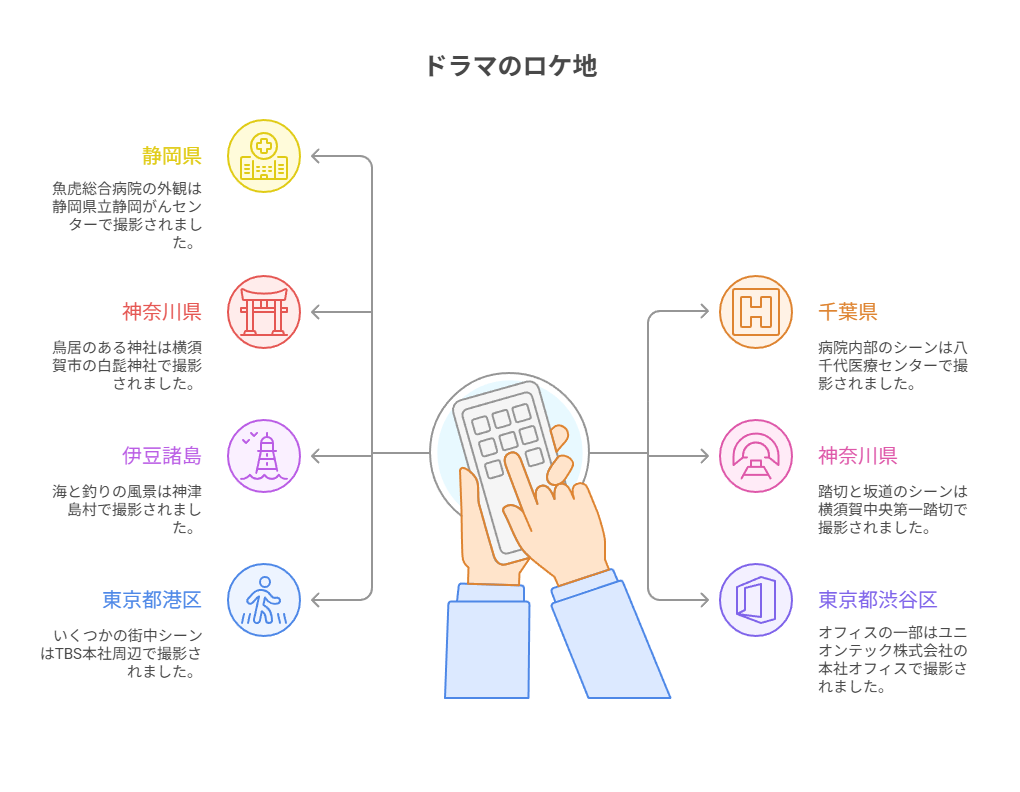 この記事では、「八千代医療センター」「静岡がんセンター」などの主要施設から、「鳥居」や「京急線沿いの坂道」、さらには「海辺の釣りシーン」まで、すべてのロケ地情報を一挙に解説します。