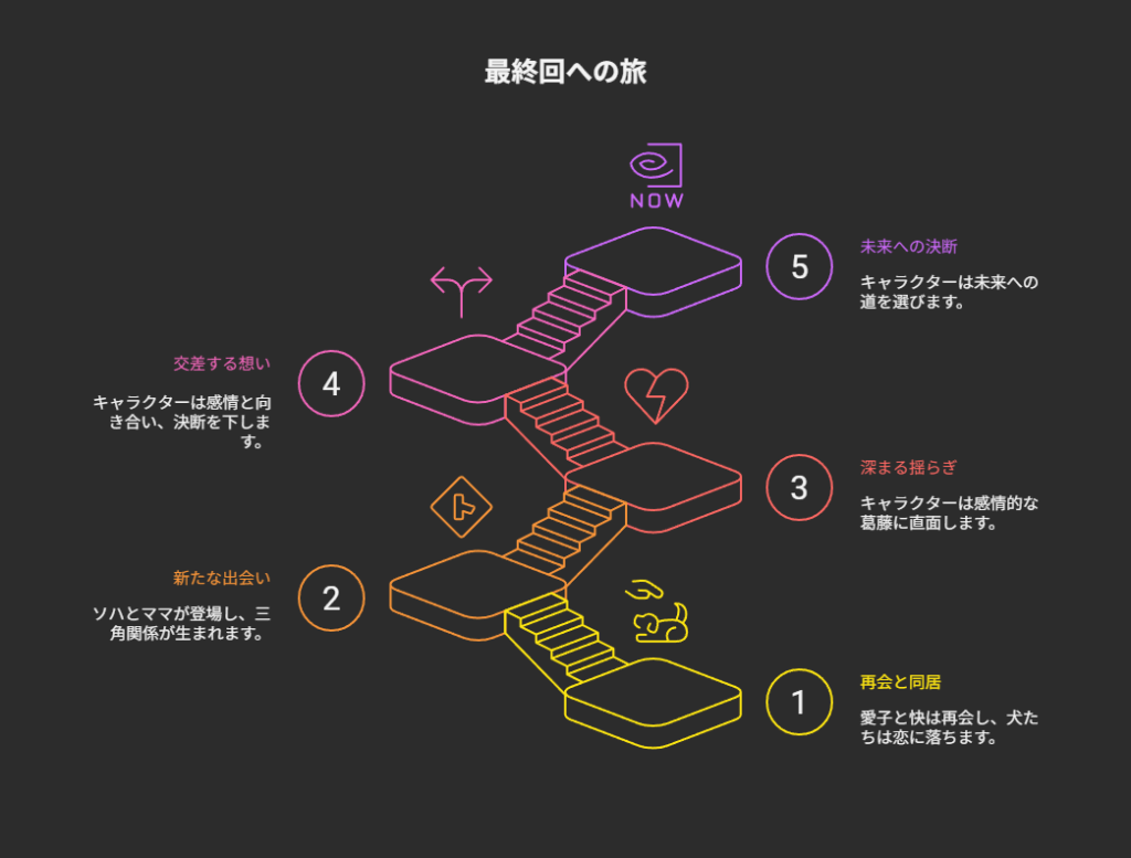 犬たちの恋が進展する中で、人間たちの心もまた少しずつ動き始めるのです。
