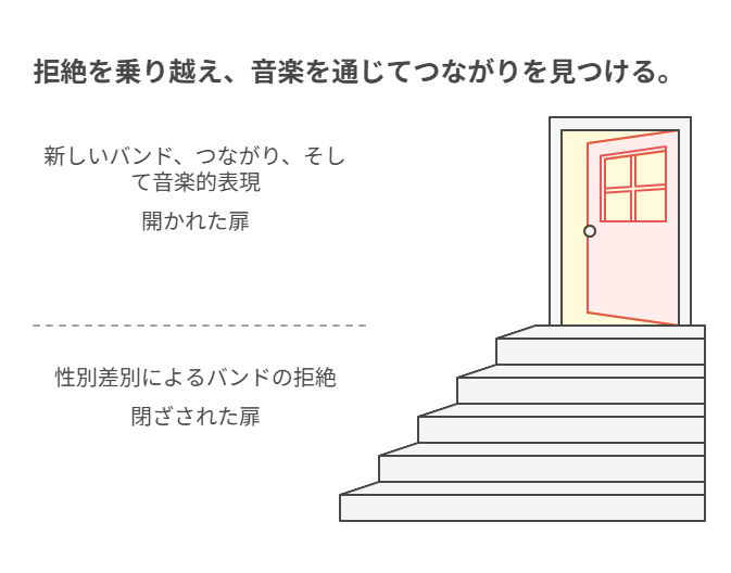 彼女はある日、所属していた学生バンドを「女だから」という理由で突然クビにされてしまいます。叩きつけられたのは、夢への扉が閉ざされるような冷たい現実。