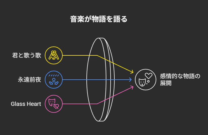 - A. 「永遠前夜」は別れと覚悟を刻むバラード、「Glass Heart」は物語のクライマックスを飾る曲です。