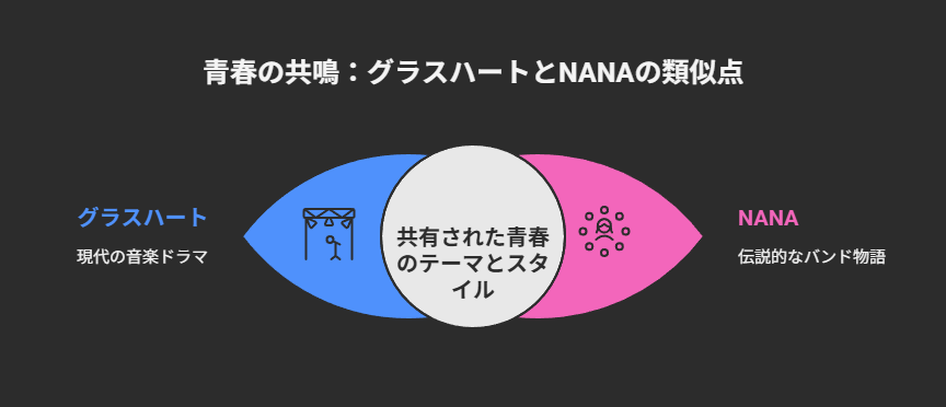 『グラスハート』が「NANAに似てる」と言われるのは、青春の葛藤や音楽への情熱、カリスマ的キャラクター描写など共通するテーマが多いからです。