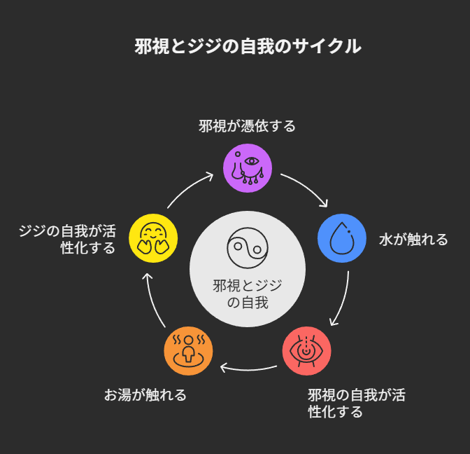 水がかかると邪視の自我、お湯でジジの自我という性質を持ちます。