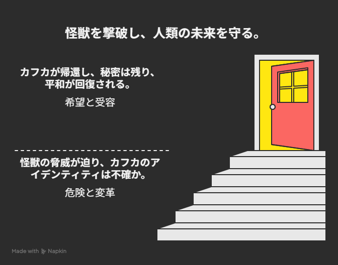 • カフカの最後:決戦後4か月を経て人間の姿で目覚め、立川基地へ帰還。社会には「怪獣8号が人々を救った」という記憶が残され、物語は復興と継承の余韻で閉じます。