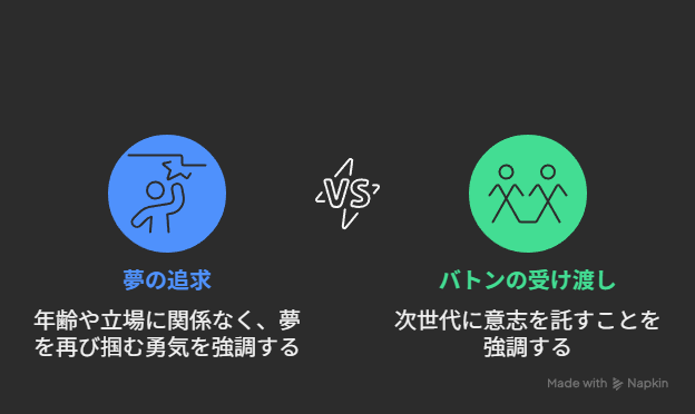 物語は「年齢や立場に関係なく、再び夢を掴む勇気」と、「その意志を次世代に託す」という二重のテーマを最後まで描き切ります。