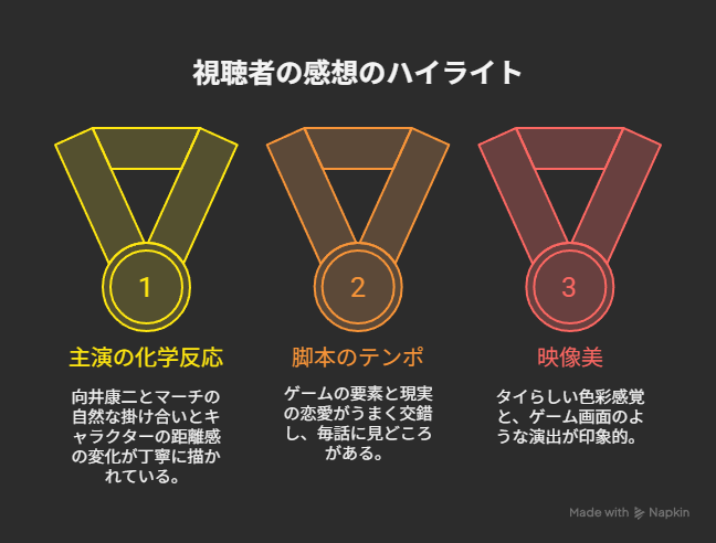 演技の自然さやストーリー展開のテンポ、ゲームと現実の恋愛が交錯する脚本の面白さが支持を集めています。
