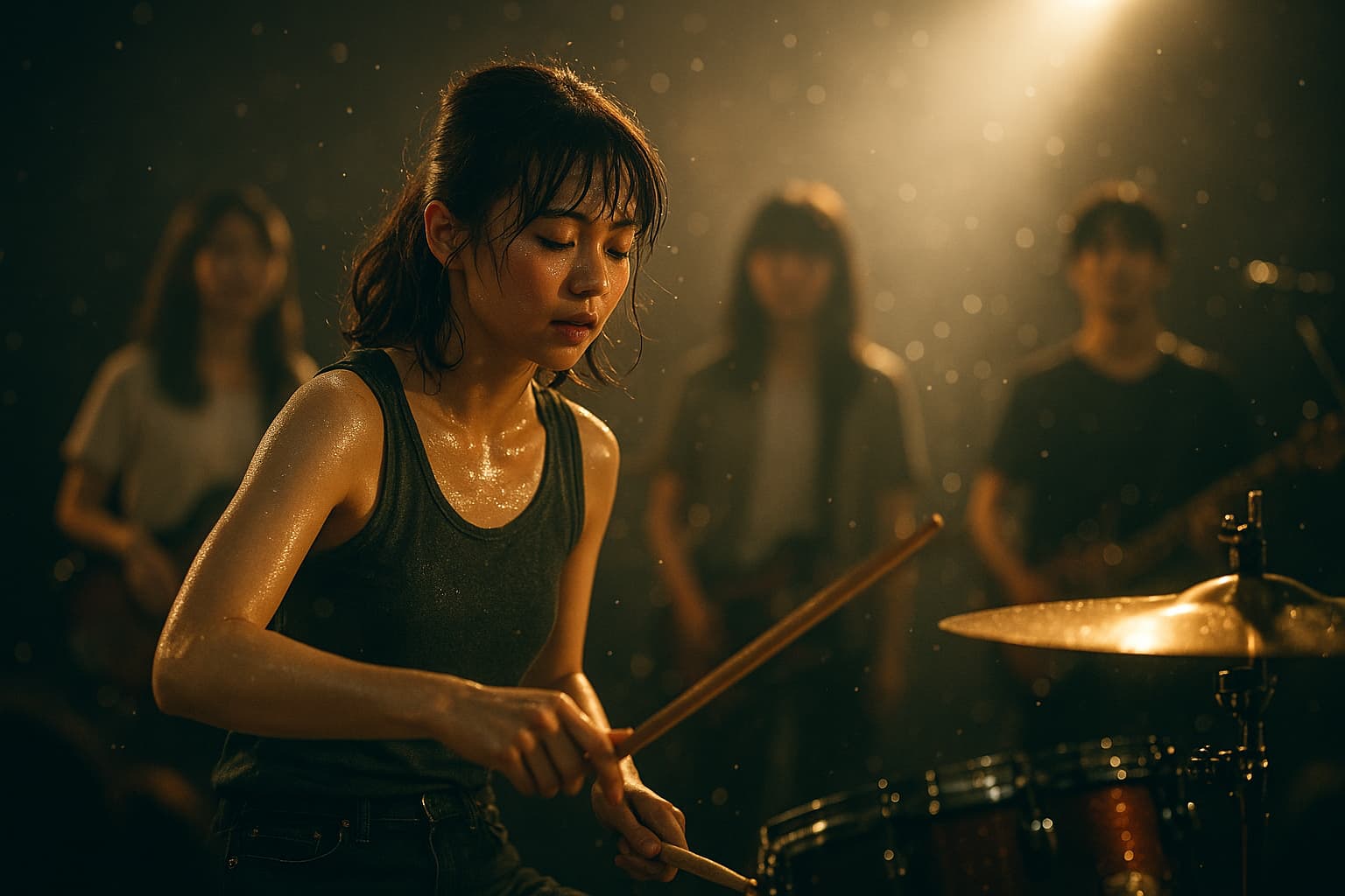 ライブ前夜、朱音はスタジオでひとり、スティックを握りしめていました。