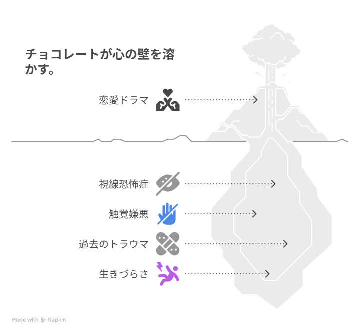 「人に触れられない男」と「人を見られない女」――二人は、同じように“生きづらさ”を抱えながら、チョコレートを通じて少しずつ心を開いていきます。