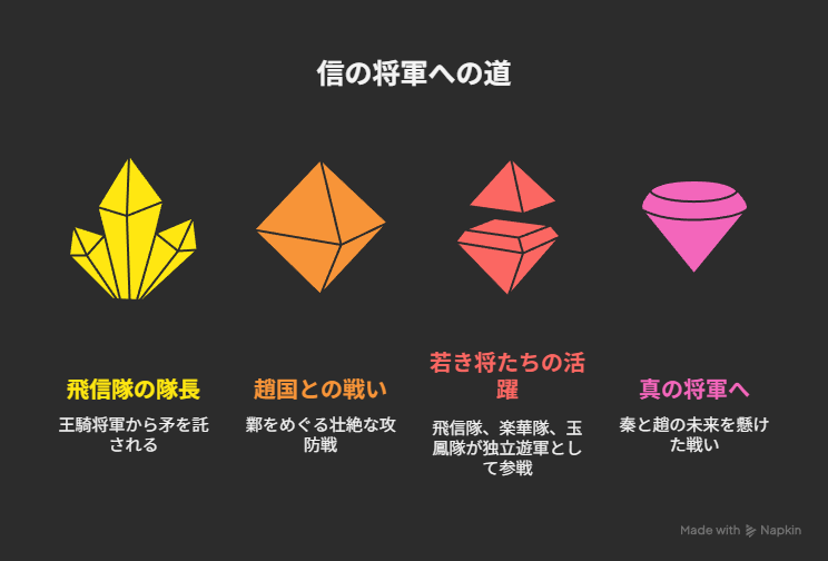 信・蒙恬・王賁という同世代の三人が、それぞれの戦場で才能を開花させていきます。